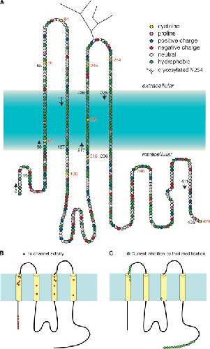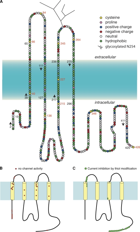 Figure 1. Topology of mouse Panx1 based on hydrophobicity plots, site-specific antibodies, and glycosylation analysis (Locovei et al., 2006a; Boassa et al., 2007). (A) The topology of Panx1 in the membrane appears to be similar to that of connexins, with four predicted TM segments, two extracellular loops, and cytoplasmic localization of the amino and carboxy termini (Locovei et al., 2006a; Boassa et al., 2007; Penuela et al., 2007). Based on hydrophobicity analysis by the software programs TMpred, TMHMM, and DNA Star, the following boundaries for the TM segments are predicted: M38-I60 for TM1, F108-W127 for TM2, L217-236 for TM3, and L275-I296 for TM4. Because of uncertainty of the predictors, the boundaries in the figure are represented by a color gradient. Positions of endogenous cysteines are indicated with red numbers. The beginning (arrows) and end of stretches of amino acids substituted by cysteines for SCAM analysis are indicated by black numbers. (B) Localization of Panx1 SCAM mutants not forming functional channels. Clusters of these mutants are in the amino terminus, the first TM segment, and the third TM segment, indicating a structural importance of these moieties. (C) Positions of modified cysteines.