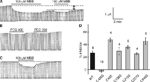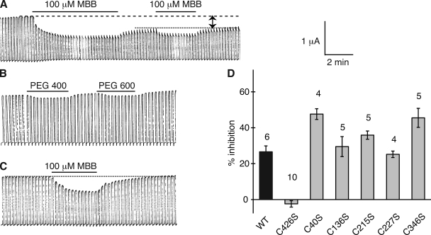 Figure 2. Membrane currents induced by voltage steps from −60 to +60 mV at a rate of five/minute in oocytes expressing wt Panx1 (A and B) or Panx1 C426S. (A) 100 µM MBB induced a twofold response in wt Panx1 channels consisting of a reversible and an irreversible component (arrows). The reversible component was inducible by a subsequent application of MBB. The irreversible component was used to assess channel inhibition in all subsequent figures. (B) PEG400 and PEG600 at 1 mM caused a similar reversible channel inhibition as MBB. (C) 100 µM MBB applied to Panx1 C426S channels exclusively caused the reversible inhibition. (D) Quantitative analysis of irreversible inhibition of membrane currents by 100 µM MBB in oocytes expressing wt Panx1 and its cysteine replacement mutants C426S, C40S, C136S, C215S, C227S, and C346S.