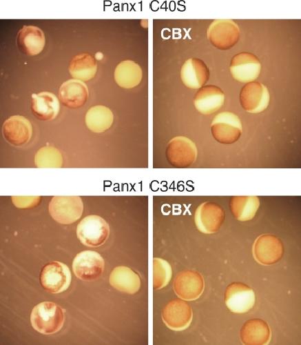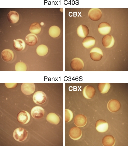 Figure 3. Micrographs of oocytes expressing Panx1 C40S or Panx1 C346S (top and bottom) incubated in OR2 medium (left) or in OR2 with 100 µM CBX (right). Pictures were taken 20 h after injection of mRNA.