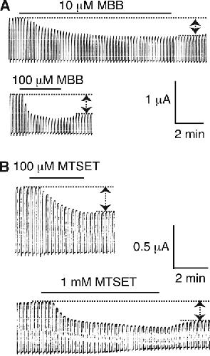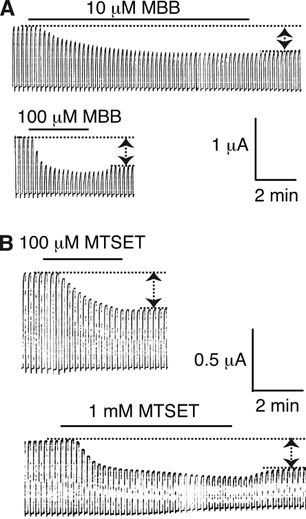 Figure 4. Dose-dependent modification of engineered cysteines in Panx1 by MBB (A) or MTSET (B). Membrane currents of oocytes expressing Panx1 I60C were attenuated by 10 or 100 µM MBB and by 100 µM or 1 mM MTSET. Both components, the reversible and the irreversible inhibition of the currents, were affected in a dose-dependent way. The reversible component was barely detectable at the lower MBB or MTSET concentrations.