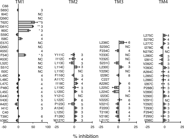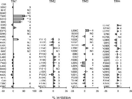 Figure 6. SCAM analysis of he four TM segments of Panx1, with MTSET as thiol reagent. Conditions were the same as described in Fig. 5, except that 1 mM MTSET was used as thiol reagent.