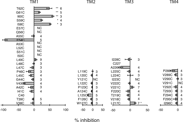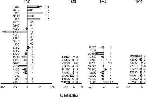 Figure 5. SCAM analysis of the four TM segments of Panx1, with MBB as thiol reagent. The amino acids are arranged in ascending order for TM1 and TM3 and in descending order for TM2 and TM4 to reflect their directional orientation in the membrane. Means ± SE of irreversible current inhibition by 100 µM MBB are plotted. The number of oocytes analyzed is indicated on the right. NC, no channel activity was detected. *, P < 0.05; **, P < 0.01 (vs. Panx1 C426S control).