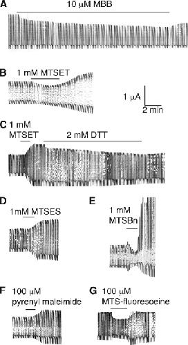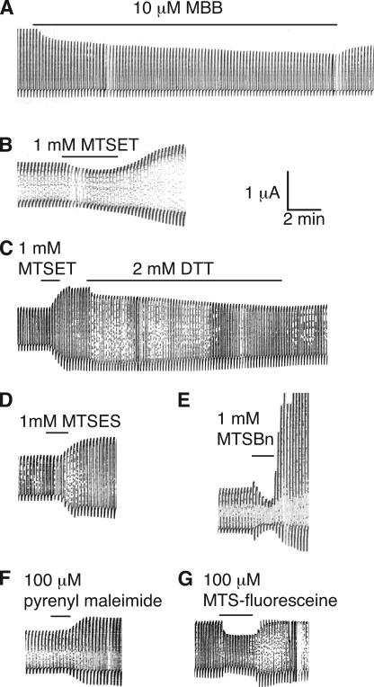 Figure 7. Effects of various thiol reagents on Panx1 F54C currents. Oocytes expressing Panx1 F54C were held at −60 mV and pulses to +60 (A) or +20 mV (B–E) were applied to activate the channel. To test for cysteine accessibility, 10 µM MBB (A), 1 mM MTSET (B), 1 mM MTSET followed by 2 mM dithiothreitol (DTT; C), 1 mM MTSES (D), 1 mM MTSBn (E), 100 µM pyrenyl maleimide (F), or 100 µM MTS-fluorescein (G) was applied.