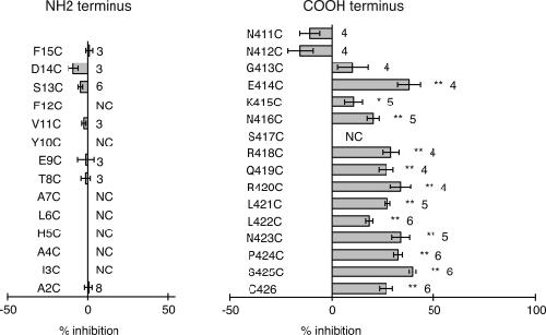 Figure 8. SCAM analysis of NH2 and C terminus of Panx1. Conditions were the same as described in Fig. 5.