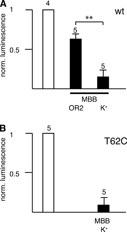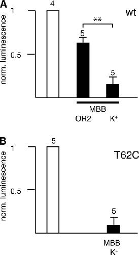 Figure 9. Effect of 1 mM MBB on ATP release from oocytes expressing wt Panx1 (A) and Panx1 T62C (B). Oocytes were preincubated with 150 mM KGlu for 10 min, and then transferred to fresh KGlu solution for a 10-min incubation period before ATP measurement in the supernatant (left column). MBB was included in the preincubation solution (right column). The middle column in A shows data for oocytes preincubated in OR2 containing MBB, and then transferred to KGlu solution. The means of ATP released from uninjected oocytes subjected to identical treatments were subtracted.