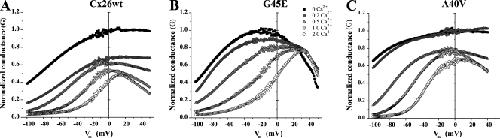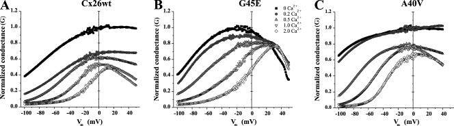 Figure 1. Regulation of WT Cx26 and A40V and G45E mutant hemichannels by voltage and extracellular Ca2+. Representative conductance-voltage (G-V) relationships are shown expressed in Xenopus oocytes at different external Ca2+ concentrations ranging from nominal (0 added) to 2 mM obtained by applying slow (3 min) voltage ramps from 50 to −100 mV to oocytes expressing WT Cx26 (A), G45E (B), or A40V (C). The holding potential before and after each ramp was maintained at −20 mV. All conductances were normalized to the maximum value measured in 0 Ca2+. In WT and both mutant hemichannels, conductance declined strongly with hyperpolarization except in low extracellular Ca2+. Increasing Ca2+ shifted activation in the depolarizing direction in all cases. However, both mutant hemichannels appeared less sensitive to the effects of Ca2+, particularly at low Ca2+ concentrations. This reduced sensitivity to Ca2+ was strongest in A40V. In addition, G45E hemichannels showed stronger voltage-dependent closure at positive voltages (up to 50 mV).