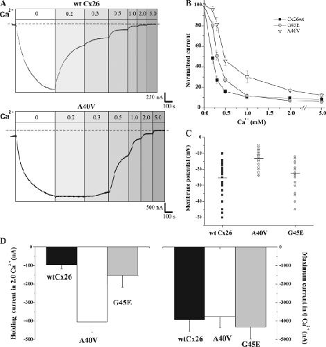 Figure 2. Steady-state Ca2+ response curves show that A40V hemichannels are less sensitive to external Ca2+ than WT Cx26 and G45E hemichannels. (A) Examples of recordings of WT Cx26 (top) and A40V (bottom) hemichannel currents and effects of increasing concentrations of extracellular Ca2+ (0, 0.2, 0.3, 0.5, 1.0, 2.0, and 5.0 mM). Oocytes were voltage clamped and maintained at −40 mV throughout. (B) Summary of data for WT Cx26 (■), A40V (∇), and G45E (○) compiled from several experiments such as that shown in A. Each point is the mean ± SEM of ∼20 experiments. (C) Plot showing resting membrane potentials measured in oocytes 24–48 h after RNA injection for WT Cx26 (■), A40V (∇), and G45E (○). Each point represents a measurement from an individual oocyte. Horizontal lines represent means of −25.1 ± 9.4 mV, −13.1 ± 5.5 mV, and −22.3 ± 8.0 mV for WT Cx26, A40V, and G45E, respectively. (D) The left panel shows the mean holding currents for oocytes from C when initially clamped to −40 mV. A40V-expressing oocytes, which showed the lowest resting potentials, showed the largest holding currents. The same oocytes exposed to 0 added Ca2+ (right) showed similar maximum current levels, indicating similar levels of expression.