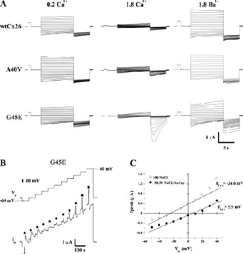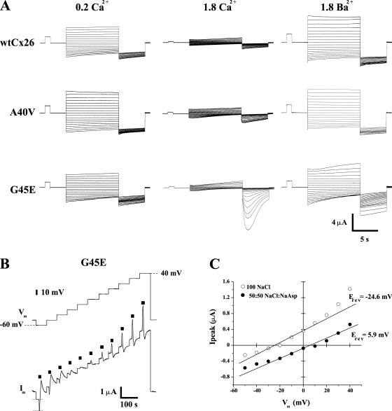 Figure 3. G45E hemichannels exhibit increased permeability to Ca2+. (A) Representative currents elicited by a series of voltage steps applied to oocytes expressing WT Cx26, A40V, and G45E. Oocytes were voltage clamped to −20 mV. The applied voltage step protocol consisted of 10-s steps from 60 to −100 mV in intervals of 10 mV followed by a 5-s step to −110 mV. Each series was repeated in extracellular solutions containing 0.2 mM Ca2+, 1.8 mM Ca2+, and 1.8 mM Ba2+. Currents from oocytes expressing any one of the three hemichannel types were similar in low Ca2+ (0.2 mM). Upon raising Ca2+ to 1.8 mM, a large transient inward current developed in oocytes expressing G45E when the voltage was stepped to −110 mV after depolarizing steps that activated these hemichannels. Equimolar substitution of Ca2+ with Ba2+ abolished the large transient inward current. Also, the hemichannel currents in Ba2+ resembled those in low Ca2+. (B and C) The transient current observed in oocytes expressing G45E represents a Ca2+-activated chloride current. (B) A representative recording of the reversal potential of the transient current for an oocyte bathed in 100 mM NaCl and 0.2 mM Ca2+. At various voltages (as indicated), oocytes were briefly exposed to 1.8 mM Ca2+ (indicated by the black boxes). The transient current that developed (filled in gray) reversed between −20 and −30 mV and was followed by a decay in the hemichannel current that reversed upon returning to 0.2 mM Ca2+. This protocol was repeated in an external solution in which 100 mM NaCl was replaced with a 50:50 NaCl/NaAsp. (C) Plot of peak transient current after exposure to 1.8 mM Ca2+ in 100 mM NaCl and 50:50 NaCl/NaAsp. Reversal potential shifted in accordance with the change in the extracellular Cl concentration.