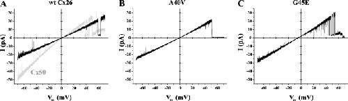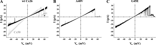 Figure 5. G45E hemichannels exhibit a larger unitary conductance. Representative examples of patch clamp recordings from inside-out patches containing single WT Cx26 (A), A40V (B), and G45E (C) hemichannels. The single hemichannel currents shown are in response to 8-s voltage ramps between ±70 mV and are leak subtracted (see Materials and methods). In contrast to other hemichannels that generally show inward current rectification in symmetric 140 mM KCl, WT Cx26 shows slight outward rectification. A recording of a single Cx50 hemichannel in the same solutions is included for comparison in A.
