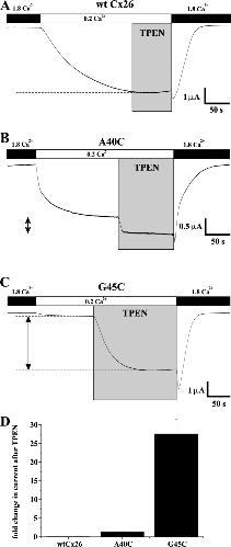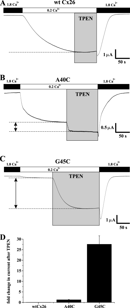 Figure 6. Cysteine substitutions at A40 and G45 produce functional hemichannels, but G45C exhibits impaired function as a result of coordination of metal ions. (A–C) Current traces from oocytes are shown expressing WT Cx26 (A), A40C (B), and G45C (C). Oocytes were held at −40 mV throughout and were exposed to a low extracellular Ca2+ (0.2 mM) solution with and without 10 µM of the heavy metal chelator TPEN. Oocytes expressing G45C show little current in 0.2 mM Ca2+ in the absence of TPEN and a large potentiation >10-fold after addition of TPEN. A40C hemichannel currents are robust in the absence of TPEN, and a small increase occurred after addition. TPEN had no effect on WT Cx26 hemichannels, which were robust upon lowering Ca2+ to 0.2 mM. (D) Summary of the effects of TPEN. Each bar represents the fold change (mean ± SEM) in current after TPEN in 0.2 mM Ca2+ (n = 9 for WT Cx26, n = 17 for A40C, and n = 51 for G45C).