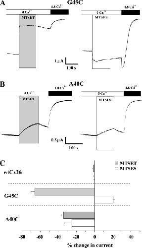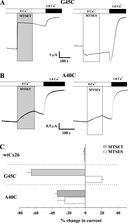 Figure 7. SCAM experiments using different MTS reagents show robust and differential effects on G45C. (A and B) The effects of MTS reagents on hemichannel currents are shown from G45C (A) and A40C (B) recorded at −40 mV. Before the recordings shown, oocytes were exposed to a solution containing 3 mM EGTA (0 Ca2+) to open hemichannels and then were exposed to the same solution containing 0.2 mM MTSET (positively charged, left) or 2.0 mM MTSES (negatively charged, right). G45C currents showed rapid and robust response to both MTS reagents that were opposite in sign, decreasing for MTSET and increasing for MTSES. Both MTS reagents decreased A40C currents, but the effects were more modest and slow in time course. (C) Summary of the percent change in current (mean ± SEM) upon application of the MTS reagent. n = 5 for WT Cx26, n = 7 for A40C, and n = 24 for G45C for MTSET. n = 7 for WT Cx26, n = 7 for A40C, and n = 23 for G45C for MTSES.