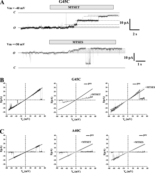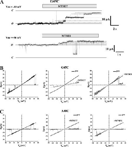 Figure 8. Single-channel SCAM indicates that G45 is a pore-lining residue. (A) Recordings of single G45C hemichannels in excised patches. The top trace is a recording from an inside-out patch held at −40 mV. Exposure to MTSET produced a stepwise reduction in current (discernable levels indicated by dashed lines). The bottom recording is from an outside-out patch held at 40 mV. Exposure to MTSES produced a stepwise increase in current (discernable levels indicated by dashed lines). C and O depict fully closed and open states in both traces. (B) Examples of G45C hemichannel currents before and after (3 min) application of MTS reagents. The left panel shows a single G45C hemichannel recording in the absence of added reagent. The solid line is a fit to the open hemichannel current. The middle and right panels show effects of MTS reagents. Solid black lines represent fits to the open hemichannel I-V relationships before MTS application. Data and fits (gray lines) are after MTS application. (C) Same as in B for single A40C hemichannels. All currents were elicited by 8-s voltage ramps between ±70 mV. Currents were leak subtracted as described in Materials and methods.