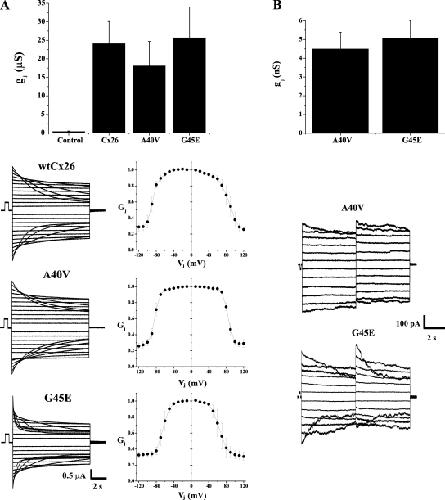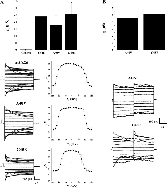 Figure 9. A40V and G45E mutants make functional cell–cell channels. (A) Bar graph showing junctional conductances, gj (mean ± SEM), measured in oocyte pairs injected with H2O (control, n = 10), WT Cx26 (n = 12), A40V (n = 8), and G45E (n = 7). Coupling was robust for WT Cx26 and both mutants compared with the control. Representative examples of junctional currents (left) along with steady-state Gj-Vj relationships (right) obtained from WT Cx26 (n = 4), A40V (n = 3), and G45E (n = 4) cell pairs. Gj is gj normalized to the maximum about Vj = 0. Records were taken from oocytes that were paired for shorter times to avoid series access resistance errors that accompany strong coupling. Vj steps between ±120 mV were applied in 10-mV increments. (B) Bar graph showing junctional conductances (mean ± SEM) measured in N2A cell pairs transfected with A40V and G45E (n = 42 for A40V, and n = 53 for G45E). Examples of junctional currents are shown below. Vj steps between ±120 mV were applied in 10-mV increments.
