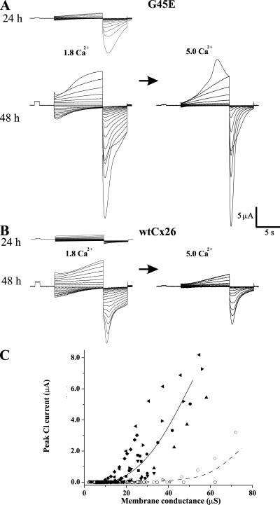 Figure 4. WT Cx26 hemichannels are also permeable to Ca2+. (A and B) Currents from oocytes expressing G45E (A) and WT Cx26 (B) recorded 24 and 48 h after injection of RNA. At 48 h, recordings are shown in 1.8 and 5.0 mM extracellular Ca2+. Voltage step protocols are the same as in Fig. 3 A. At 48 h, oocytes expressing G45E show larger hemichannel currents in 1.8 Ca2+ (compared with 24 h) along with larger Ca2+-activated Cl currents. Upon raising Ca2+ to 5 mM, G45E hemichannels continued to activate at positive voltages and to induce Ca2+-activated Cl currents. With increased expression of WT Cx26 hemichannels, Ca2+-activated Cl currents were also induced, albeit more weakly in comparison to G45E. (C) Peak chloride current is plotted as a function of the membrane conductance. Measurements were obtained from the same voltage protocol as shown in A and B). The magnitude of the chloride current was measured at the peak that developed at −110 mV after the activating voltages steps. Baseline was taken as the instantaneous current upon stepping to −110 mV that preceded the development of the large inward transient. The membrane conductance was measured at the end of the activating voltage step, the bulk of which was caused by hemichannel activation. Open symbols are data from WT Cx26, and closed symbols are from G45E. Experiments from individual oocytes are plotted as different symbol shapes. Lines represent fits (by eye) to the data for illustration purposes. n = 8 oocytes for G45E, and n = 9 oocytes for WT Cx26.