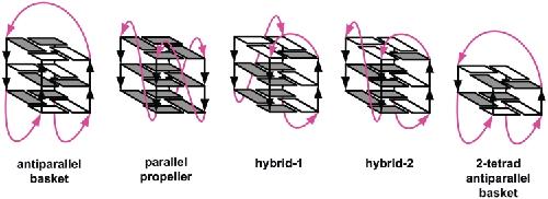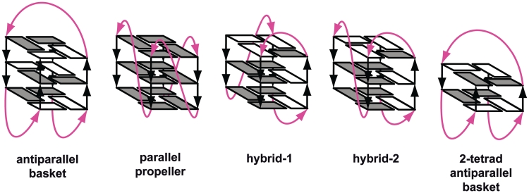 Figure 1. Schematic structures of intramolecular G-quadruplexes formed by four-repeat human telomeric sequences. Loops are colored magenta; anti and syn guanines are colored grey and white, respectively.