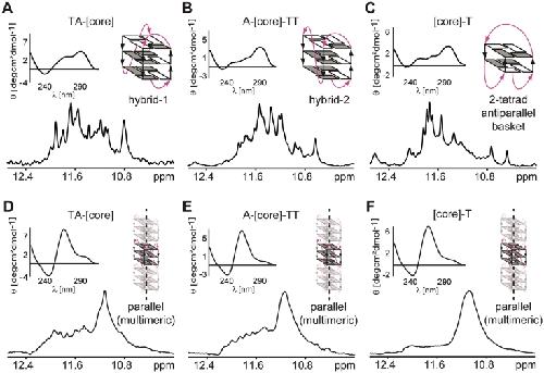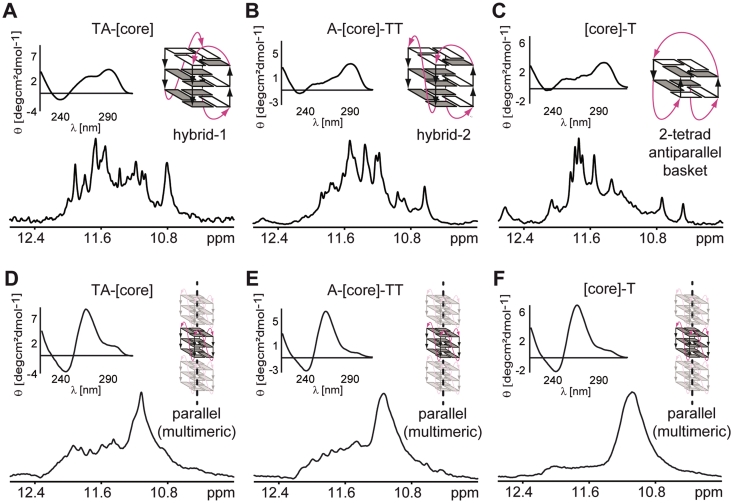 Figure 2. CD spectra and imino regions of 1D 1H 11-echo NMR spectra for [TA-core], [A-core-TT] and [core-T] constructs in intra-oocyte buffer (A–C), and in intra-oocyte buffer supplemented with 40% PEG 200 (D–F) are shown, accompanied by schematic representations of the assumed G-quadruplex conformations. Loops are colored magenta; anti and syn guanines are colored grey and white, respectively.