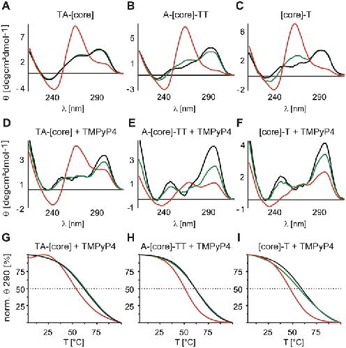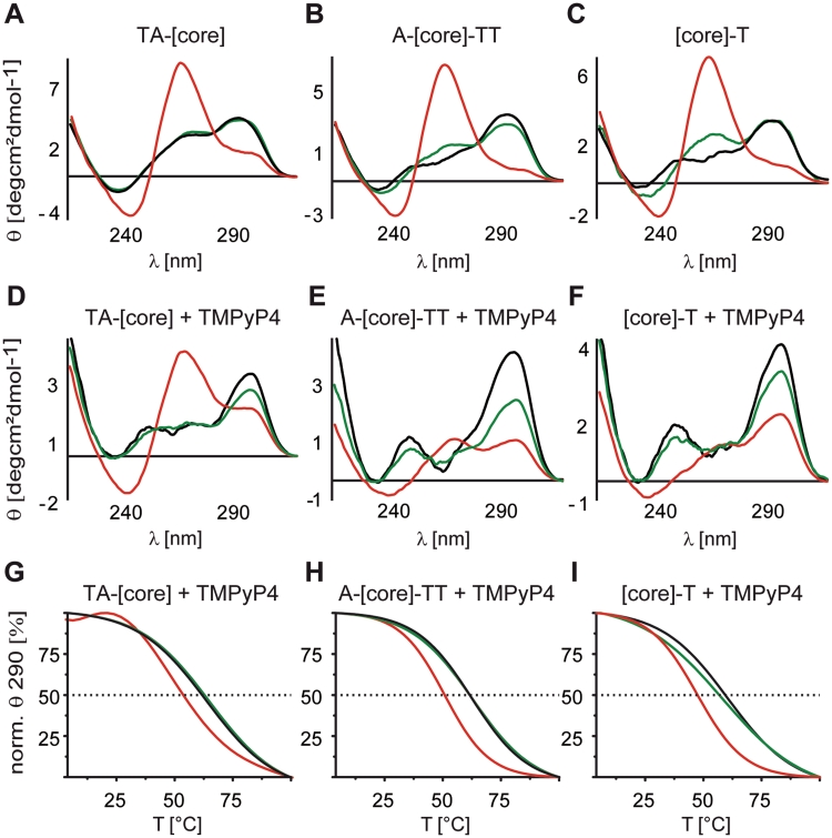 Figure 4. Overlays of CD spectra of 50 µM [TA-core], [A-core-TT] and [core-T] constructs in intra-oocyte buffer (A–C black lines), supplemented with either 40% PEG 200 (A–C red lines) or 40% Ficoll 70 (A–C green lines) and after the addition of 100 µM TMPyP4 and 12 h sample incubation at 4°C (D–F). Corresponding melting profiles were recorded by measuring the ellipticity at 290 nm, monitoring the stability of antiparallel G-quadruplex conformations of [TA-core], [A-core-TT] and [core-T] in the presence of TMPyP4 (G–I).