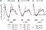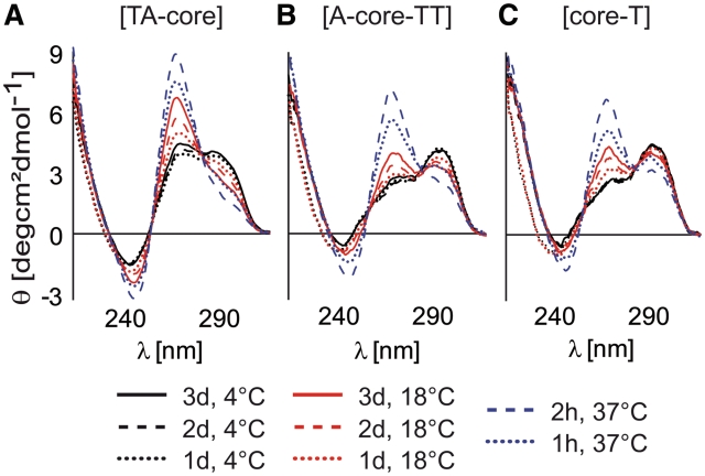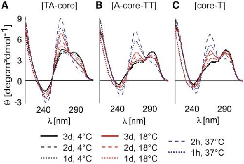 Figure 5. CD spectra of 5 × 10−6 M [TA-core], [A-core-TT] and [core-T] constructs mixed with 40% PEG at different temperatures and incubated for various periods of time. In studies employing synthetic polymers as MC mimetics, re-annealing of DNA constructs in the presence of MC agents is typically used to accelerate the MC promoted DNA refolding. However, re-annealing of DNA constructs in X. laevis egg extracts cannot be performed as it would lead to thermal denaturation of proteins that are dominant contributing factors to the native MC environment. Here, we show that the CD spectra of telomeric constructs incubated in the presence of PEG for 2 h at 37°C are essentially the same as those obtained for the telomeric constructs re-annealed in the presence of PEG (cf. Figure 2D–F). To avoid any bias from differences in sample preparations, the telomeric repeat constructs were incubated in X. laevis egg extract and 40% PEG 200 for 2 h at 37°C prior to acquisition of NMR spectra (see Figure 6).