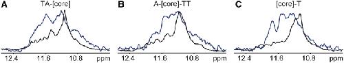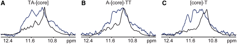 Figure 6. Overlays of imino regions of 1D 1H 11-echo NMR spectra of the telomeric constructs in X. laevis egg extract (A–C blue lines) and in intra-oocyte buffer supplemented with 40% PEG 200 (A–C black lines). In the presence of PEG, several small and dispersed peaks can be observed between 11.5 and 12.4 ppm in the NMR spectra of [TA-core] and [A-core-TT] constructs (A and B black lines). These peaks can be attributed to low-level populated alternative conformation(s) co-existing in equilibrium with the dominant parallel high-order structures based on the analysis native PAGE data (Supplementary Figures S1 and S2).