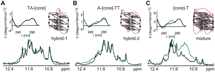 Figure 3. Overlays of CD spectra and imino regions of 1D 1H 11-echo NMR spectra for [TA-core], [A-core-TT] and [core-T] constructs in intra-oocyte buffer, and in intra-oocyte buffer supplemented with 40% Ficoll are shown, accompanied by schematic representations of the assumed G-quadruplex conformations (A–C). Loops are colored magenta; anti and syn guanines are colored grey and white, respectively.