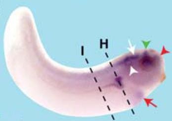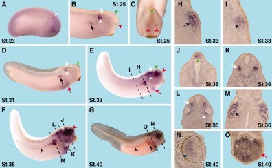 Figure 2. Spatial expression pattern of ProSAP1/Shank2 during Xenopus embryogenesis. A: Lateral view of an embryo at stage 23. ProSAP1/Shank2 is expressed in the otic vesicle (white arrowhead). B: Lateral view of an embryo at stage 25. ProSAP1/Shank2 transcripts are detected in the otic vesicle (white arrowhead), pronephric anlage (black arrow), forebrain (red arrowhead), isthmus (green arrowhead), and hindbrain (white arrow). C: Anterior view of the embryo shown in C. ProSAP1/Shank2 can be visualized in the forebrain (red arrowheads) and the isthmus (green arrowhead). DâG: Lateral views of Xenopus embryos at stages indicated. ProSAP1/Shank2 expression is demonstrated in the otic vesicle (white arrowhead), developing pronephros (black arrow and arrowhead), forebrain (red arrowhead), isthmus (green arrowhead), and hindbrain (white arrow). In addition, ProSAP1/Shank2 transcription in the liver begins (red arrow). Dotted lines indicate the level of transverse sections shown in H-O. H: ProSAP1/Shank2 is expressed in the proximal and intermediate tubule (arrow). I: ProSAP1/Shank2 transcripts are detected in the connecting tubule anlage (arrowhead). J: ProSAP1/Shank2 expression is clearly seen in the isthmus (green arrowhead). K: The transverse sections through an embryo at stage 36 display ProSAP1/Shank2 expression in the ventral interneurons of the hindbrain (white arrow). L: ProSAP1/Shank2 is expressed in the otic vesicle (white arrowhead) as well as the hindbrain (white arrow) at stage 36. M: ProSAP1/Shank2 transcripts can be visualized in the proximal and intermediate pronephric tubules (black arrow). N: At stage 40, ProSAP1/Shank2 is expressed in the retina of the eye (blue arrowhead). O: The transverse section shows that ProSAP1/Shank2 transcripts are strongly detectable in the liver (red arrow).Download figure to PowerPoint