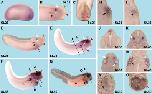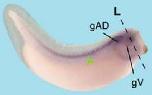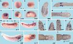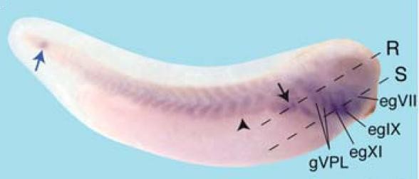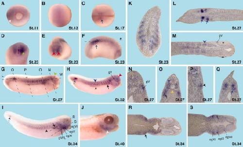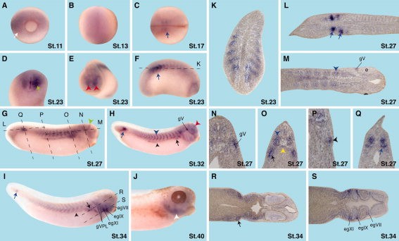 Figure 5. Spatio-temporal expression of LAPSER1 during X. laevis development. A: Ventral view of an embryo at stage 11. LAPSER1 is expressed in the migrating meso-ectoderm (white arrow). B: Dorsal view of an embryo at stage 13. Posterior is to the top. A faint LAPSER1 expression can be seen in the dorsal part of the embryo. C: Dorsal view of an embryo at stage 17, anterior orientated to the right. The blue arrow depicts LAPSER1 expression in the segmenting somites. D: Ventral view of a Xenopus tail. LAPSER1 transcripts can be detected in the proctodeum (green arrow). E: Anterior view of an embryo at stage 23. LAPSER1 can be visualized in the forebrain (red arrowheads). FâJ: Lateral views of Xenopus embryo at indicated stages. F: LAPSER1 expression is shown in the somites that undergo segmentation (blue arrow). G: LAPSER1 is expressed in the isthmus (green arrowhead). Dotted lines indicate level of sections shown in LâQ. H: At stage 32, LAPSER1 is expressed in the posterior somites that undergo segmentation (blue arrow), the segmented somites (blue arrowhead), the pronephros (black arrow and arrowhead), and the trigeminal ganglion (gV). I: LAPSER1 is clearly expressed in some cranial ganglions as indicated. In addition, LAPSER1 transcripts are found in the proximal part of the pronephros (arrow) and slightly in the collecting tubule (arowhead). Dotted lines indicate level of sections shown in R and S. J: At stage 40, LAPSER1 expression is detected in the head mesenchyme (white arrowhead). KâM, R,S: Horizontal sections. NâQ: Transverse sections. K: LAPSER1 is strongly expressed in the somites undergoing segmentation. L: LAPSER1 transcripts can be detected in the segmenting and rotating somites (blue arrows). M: LAPSER1 is slightly expressed in the somites (blue arrow) and the trigeminal ganglion (gV). N: LAPSER1 can be visualized in the trigeminal ganglion (gV). O: LAPSER1 is expressed in the somites (blue arrowhead), the hypochord (yellow arrowhead), and the proximal pronephros anlage (black arrow). P: LAPSER1 is detectable in the forming collecting tubule of the pronephros. Q: LAPSER1 transcripts in the somites (arrow). R: LAPSER1 is expressed in the proximal tubule (arrow). S: LAPSER1 mRNA can be localized in diverse cranial ganglions as indicated. e, eye; egVII, facial epibranchial ganglion; egIX, glossopharyngeal epibranchial ganglion; epXI, first vagal epibranchial ganglion; gV, trigeminal ganglion; gVPL, cells that contribute to the vagal and posterior lateral line ganglion.Download figure to PowerPoint