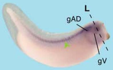 shank3( SH3 and multiple ankyrin repeat domains 3 ) gene expression in Xenopus laevis embryos, NF stage 32, as assayed by in situ hybridization. Lateral view: anterior right, dorsal up. note although expression is attributed to tropicalis, this is a laevis embryo