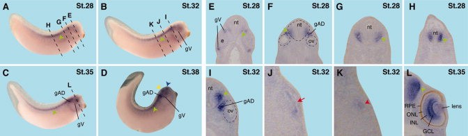 Figure 1. The spatio-temporal expression of Shank1 in Xenopus development. AâD: Lateral views of Xenopus embryos. A: At stage 28, Shank1 is expressed in the neural tube (green arrowhead). Dotted lines indicate the level of sections shown in EâH. B: Shank1 transcripts are detected in the neural tube (green arrowhead) and the trigeminal ganglion (gV) at stage 32. Dotted lines indicate the level of sections shown in IâK. C: At stage 35, Shank1 can be visualized in the neural tube (green arrowhead), the trigeminal ganglion (gV), as well as the anteriordorsal lateral line ganglion (gAD). Dotted line indicates the level of section in L. D: Shank1 is expressed in the posterior neural tube (green arrowhead), fore- and midbrain (blue and yellow arrowhead). In addition, Shank1 is detected in the trigeminal ganglion (gV) as well as the anteriordorsal lateral line ganglion (gAD) to this time point of development. EâH: Transverse sections through an embryo at stage 28. E: Shank1 mRNA molecules are visualized in the trigeminal ganglion (gV) and very weakly in the ventral neural tube (green arrowhead). F: Shank1 is expressed in the ventral neural tube (green arrowhead) and the anteriordorsal lateral line ganglion (gAD). Dotted lines surround the neural tube (nt) and the otic vesicle (ov). G,H: Shank1 transcripts are detected in the posterior ventral neural tube (green arrowhead). IâK: Transverse sections through an embryo at stage 32. I: Shank1 is expressed in the anteriordorsal lateral line ganglion (gAD) and the ventral neural tube (green arrowhead). J: Shank1 transcripts can be visualized in the proximal pronephros (red arrow). K: Shank1 mRNA molecules are located in the distal pronephric tubule (red arrowhead). L: Transverse section at stage 35. Shank1 is expressed in the ventral portion of the midbrain. In addition, Shank1 transcripts are detected intensely in the ganglion cell layer (GCL) and more weakly in the inner nuclear layer of the retina. e, eye; gAD, anteriordorsal lateral line ganglion; GCL, ganglion cell layer; gV, trigeminal ganglion; INL, inner nuclear layer; nt, neural tube; ONL, outer nuclear layer; ov, otic vesicle.Download figure to PowerPoint