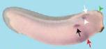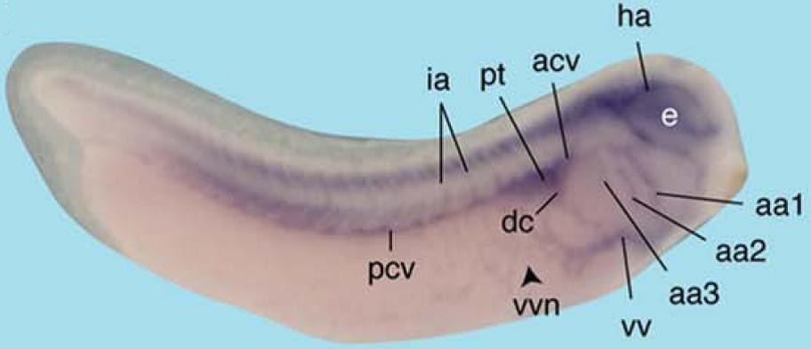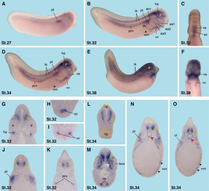 Figure 3. ProSAP2/Shank3 expression during Xenopus embryonic development. A: Lateral view of an embryo at stage 27. ProSAP2/Shank3 is expressed in the proximal tubule (pt) anlage of the pronephros. B: At stage 32, ProSAP2/Shank3 is predominantly expressed in the cardiovascular system. C: Ventral view. ProSAP2/Shank3 transcripts can be visualized in the ventral aorta (va) and the endocardium (ec). D, E: Lateral views of Xenopus embryos at stage 34 and 38. ProSAP3/Shank3 mRNA is localized in the cardiovascular system as indicated. F: Ventral view of an embryo at stage 38. ProSAP2/Shank3 is expressed in the ventral aorta (va) and the vitelline veins (vv). GâO: Transverse sections through Xenopus embryos at different stages as indicated. G: ProSAP2/Shank3 mRNA molecules are stained in the ventral interneurons of the neural tube (green arrowhead) as well as the developing head arteries (ha). H: ProSAP2/Shank3 is expressed in the endocardium (ec) of the heart. I: At stage 32, ProSAP2/Shank3transcripts can be visualized in the vitelline veins (vv). J: ProSAP3/Shank3 is expressed in the ventral interneurons of the neural tube (green arrowhead) and in the proximal tubule (pt) of the pronephros. K: At stage 32, ProSAP2/Shank3 transcripts are detected in the posterior cardinal veins (pcv) and in the media-lateral portion of the neural tube, the marginal and subventricular zones (green arrowhead). L: ProSAP2/Shank3 is expressed in the isthmus (yellow arrowhead) and the ventral-lateral neural tube. M: ProSAP3/Shank3 transcripts are detectable in the ventral interneurons of the midbrain (green arrowhead), the retina of the eye (white arrowhead), and the ventral aorta (va). N,O: ProSAP2/Shank3 is expressed in the medio-lateral neural tube (green arrowhead), the proximal tubule (N; pt) and connecting tubule (O; ct) of the pronephros, the vascular vitelline network (black arrowheads; vvn), as well as the hypochord (red arrowhead). The notochord is surrounded by a dotted line. aa, aortic arch arteries; acv, anterior cardinal vein; cg, cement gland; ct, collecting tubule of the pronephros; dc, Duct of Cuvier; e, eye; ec, endocardium; ha, head arteries; ia, intersomitic arteries; pcv, posterior cardinal vein; pt, proximal tubule of the pronephros; va, ventral aorta; vv, vitelline veins; vvn, vascular vitelline veins.Download figure to PowerPoint