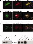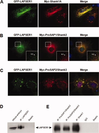 Figure 4. The interaction of LAPSER1 and all members of the ProSAP/Shank family is conserved among species. A: GFP-LAPSER1 and Myc-Shank1A co-localize within clustered and filamentous structures in COS-7 cells. B: Punctate, vesicular structures mark sites where GFP-LAPSER1 and Myc-ProSAP1/Shank2 co-localize with each other in COS-7 cells. C: GFP-LAPSER1 and Myc-ProSAP2/Shank3 are physically attached to each other within prominent clusters in COS-7 cells. D: LAPSER1 can be detected in whole Xenopus laevis embryos (St. 33) using a rat anti-LAPSER1 antibody. LAPSER1 protein is enriched after immunoprecipitation with the rat anti-LAPSER1 antibody from a whole embryo lysate. Immunoprecipitation without an antibody (beads only) served as negative control. Whole embryo lane reflects 1/10 of the IP input. E: Endogenous ProSAP1/Shank2, ProSAP2/Shank3, and Shank1 are precipitated from Xenopus whole embryo lysate (St. 31â35) and LAPSER1 is detected in all precipitates by Western blot analysis. Immunoprecipitation using an unrelated IgG antibody against GFP (IgG) or without any antibody (beads only) serve as negative controls.Download figure to PowerPoint