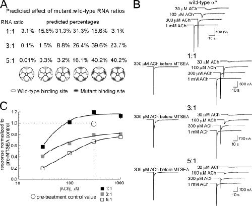 Figure 2. Coexpression of either L119C or Y188F with wild-type α7 subunits at varying ratios. (A) The probability for the distribution of mutant subunits based on RNA ratios. Each single subunit within a pentamer is either mutant or wild-type, and if we assume X = probability of being wild-type (actually α7C116S) and Y = probability of being mutant, then 1 = X + Y, and for combinations of five subunits, (X + Y)n = 1. The expansion of this binomial is X5 + 5X4Y + 10X3Y2 + 10X2Y3 + 5XY4 + Y5 = 1. We assume that receptors are functionally equivalent regardless of the subunit positions within the pentameric structure. (B) Data traces obtained from oocytes expressing the α7C116S/L119C MTSEA-sensitive mutant and the α7C116S cysteine-null pseudo wild-type at the ratios indicated. For each panel, the traces on the left are the 300-µM ACh control responses obtained before the MTSEA treatment, and the series of traces on the right are the responses to progressively greater concentrations of ACh obtained after the MTSEA treatment. (C) Average net charge values for oocytes expressing the α7C116S/L119C MTSEA-sensitive mutant and α7C116S cysteine-null pseudo wild-type at the ratios indicated after treatment with MTSEA, normalized to the 300-µM ACh control responses before MTSEA treatment. The open circles represent the 300-µM ACh control data obtained before the MTSEA treatment (i.e., the values to which the posttreatment data are normalized). The data plotted are the means ± SEM for at least five oocytes at each of the ratios tested. See Table I for curve fit values.