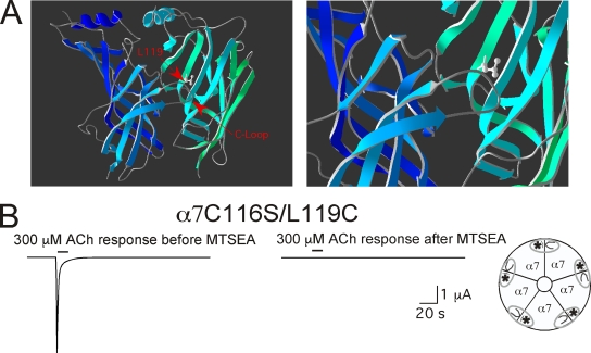 Figure 1. Location of the L119 residue in a homology model of α7 (Celie et al., 2004). (A) The overview at left shows an α7-α7 homodimer and the location of the L119 residue in relation to the C-loop in the primary face of the agonist binding site. The image on the right shows the proximity at increased magnification. Images were created in Deep View (Swiss-PdbViewer; Guex and Peitsch, 1997) from the crystal structure model of the ACh binding protein (deposited in the Protein Data Bank under accession no. 1I9B; Brejc et al., 2001). (B) The effect of MTSEA treatment (2 mM for 60 s) on the ACh-evoked responses of oocytes expressing the α7L119C mutation in a cysteine-null (α7C116S) background. In this experiment, peak current responses to 300 µM ACh were reduced 99.4 ± 0.2%, and net charge was reduced by 99.7 ± 0.1% (n = 4). Responses to 3 mM ACh were reduced to a similar extent: 97.9 ± 0.3 and 95.9 ± 2.0% for peak current and net charge, respectively (n = 4).