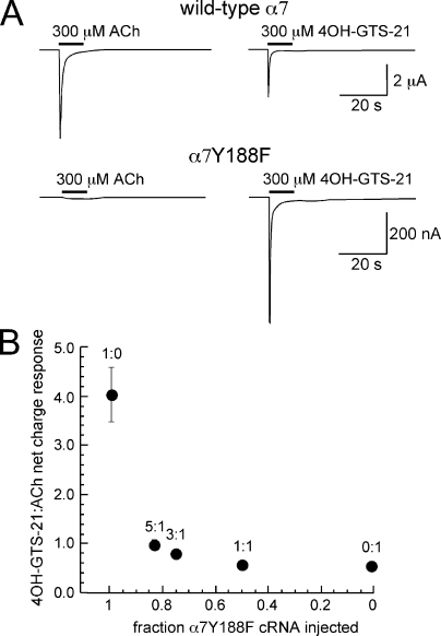 Figure 3. Probing for an α7 C-loop mutation with selective and nonselective agonists. (A) Mutation of the α7 tyrosine 188 to phenylalanine reduces sensitivity to low concentrations of ACh, with little impact on sensitivity to the responses to the α7-selective agonist 4OH-GTS-21 (Horenstein et al., 2007). The upper traces are representative responses of oocytes expressing wild-type α7, for which 300 µM 4OH-GTS-21 evoked responses that are 57 ± 4% the magnitude of the responses evoked by 300 µM ACh, in net charge. In contrast, for oocytes expressing α7Y188F, 300-µM 4OH-GTS-21–evoked net charge responses that are 405 ± 55% of the magnitude of the responses evoked by 300 µM ACh. (B) Oocytes were injected with RNA for α7Y188F and wild-type α7 at (mutant/wild-type) 1:0, 5:1, 3:1, 1:1, and 0:1 ratios and then tested for their relative responses to 300 µM ACh and 300 µM 4OH-GTS-21. The values are plotted in relation to the fraction of α7Y188F RNA injected at each ratio and are the means ± SEM of at least four oocytes for every condition.
