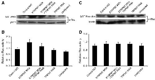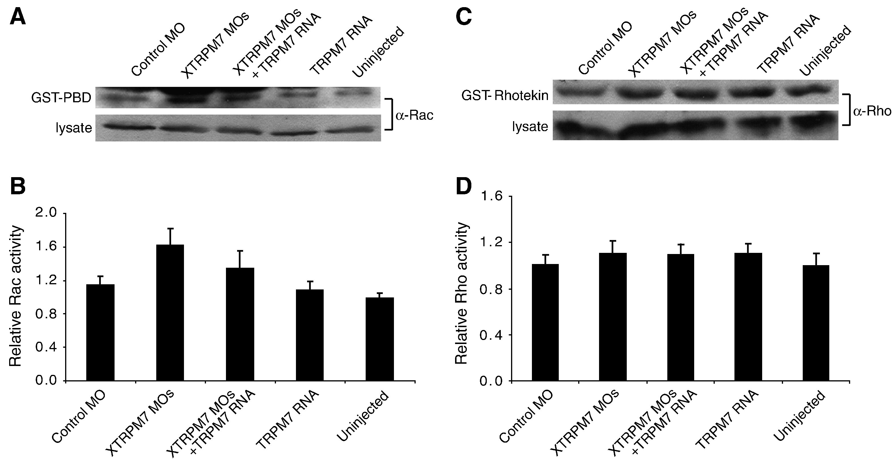 Fig. 6. TRPM7 regulates Rac but not Rho activation levels. (A) Western blot analysis and quantification of levels of activated Rac at stage 10.5 during gastrulation. Injection of 75 ng of XTRPM7 MOs increased levels of activated Rac, which could be prevented by co-injection of 500 pg of TRPM7 RNA. (B) Quantification of the results in (A), the error bars represent the s.d. from at least five independent experiments. (C) Western blot analysis and quantification of levels of activated Rho at stage 10.5 during gastrulation. Levels of activated Rho were unaffected by injection of XTRPM7 MOs or TRPM7 RNA. (D) Quantification of the results in (C); error bars represent the s.d. from at least four independent experiments.