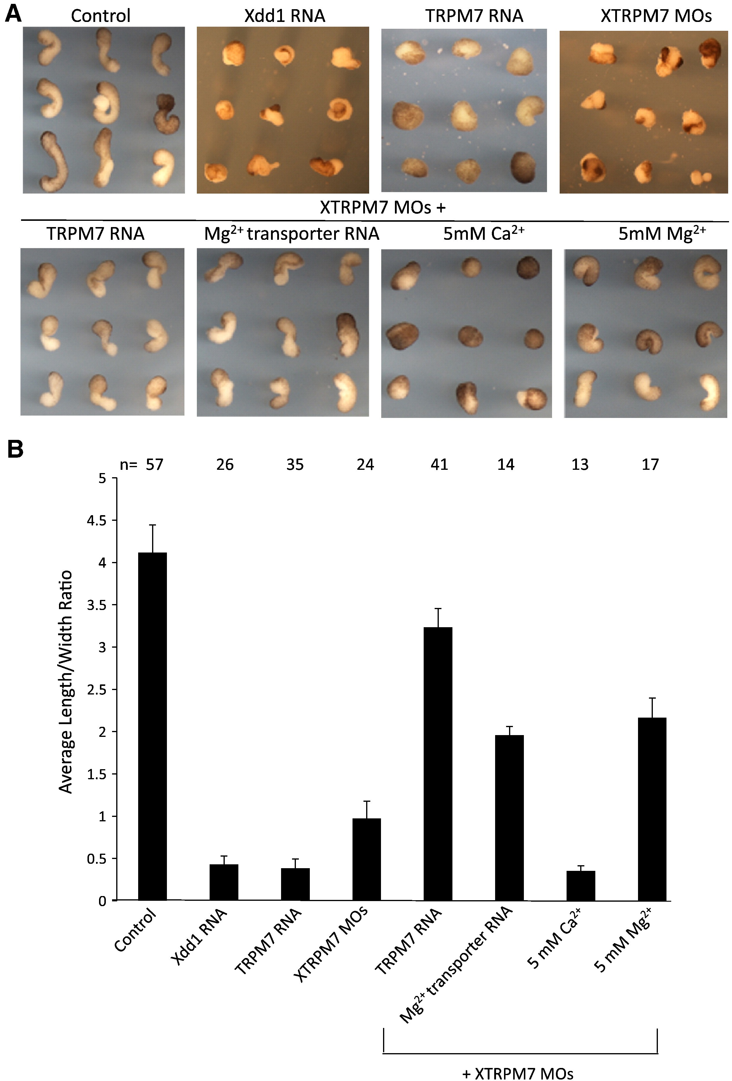 Fig. 3. XTRPM7 is required for convergent extension movements. (A) Dorsal marginal zone (Keller) explant assay revealed that overexpression of TRPM7 (2 ng) and injection of XTRPM7 MOs inhibit convergent extension movements. Dominant negative Dishevelled (Xdd1, 2 ng) was used as a positive control. Inhibition of convergent extension produced by depletion of XTRPM7 was rescued by co-injection of XTRPM7 MOs with TRPM7 RNA (400 pg) and the Mg2+ transporter SLC41A2 (400 pg), as well as supplementation of the buffer with 5 mM Mg2+ but not 5 mM Ca2+. (B) Quantification of Keller explant assay; bars indicate the average length to width ratio of Keller explants and the number of explants analyzed is shown above each bar.
