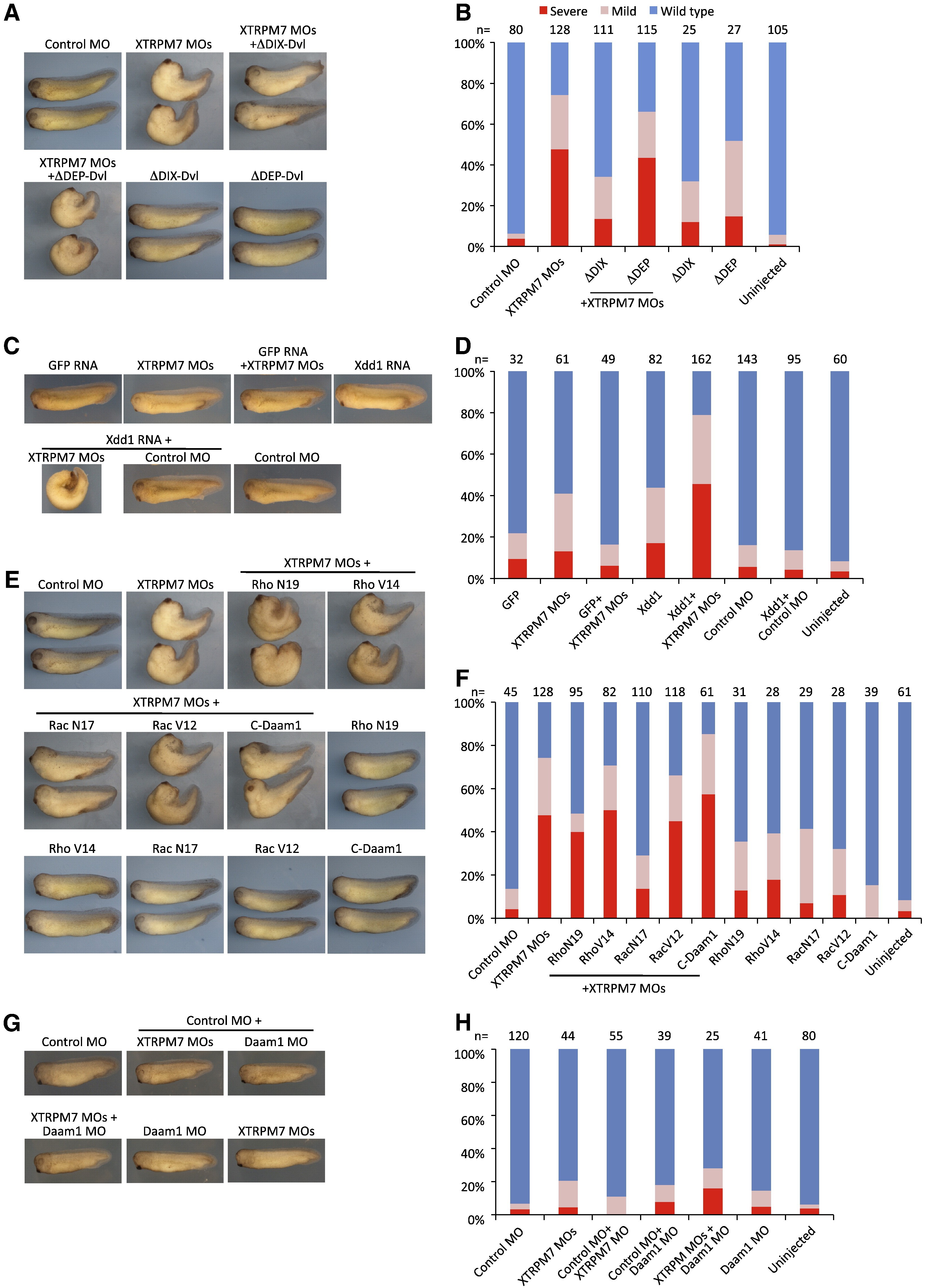 Fig. 5. TRPM7 is required for regulation of Rac and non-canonical Wnt signaling.(A) Disruption of gastrulation produced by injection of XTRPM7 MOs (75 ng) can be suppressed by co-injection of dominant active Dishevelled (δDIX-Dvl) RNA (400 pg), but not by injection of Dishevelled lacking the DEP domain (δDEP-Dvl, 400 pg), whose deletion disrupts activation of the Rac component of the PCP pathway. (B) Quantification of the phenotypes observed with separate or co-injections of XTRPM7 MOs with δDIX-Dvl, and δDEP-Dvl RNAs. The number of embryos scored is indicated above each bar. (C) Co-injection of dominant negative Dishevelled (Xdd1) RNA (250 pg) and XTRPM7 MOs (25 ng) synergistically inhibit gastrulation but have little or no effect when injected separately. GFP RNA was injected at 250 pg. (D) Quantification of the phenotypes observed with separate or co-injections of XTRPM7 MOs with Xdd1. The number of embryos scored is indicated above each bar. (E) Co-injection of XTRPM7 MOs with dominant negative RacN17 RNA (500 pg), but not with C-Daam1 cDNA (250 pg), RNAs for dominant negative RhoN19 (500 pg) or with the dominant active mutants RacV12 (10 pg) and RhoV14 (10 pg), prevents the disruption of gastrulation caused by the XTRPM7 MOs. (F) Quantification of the phenotypes observed with separate or co-injections of XTRPM7 MOs with RacN17, RacV12, RhoN19 and RhoV14 RNAs and C-Daam1 cDNA. The number of embryos scored is indicated above each bar. (G) Co-injection of a low concentration of XTRPM7 MOs (25 ng) with control MO (25 ng) or with Daam1 MO (25 ng) did not produce synergistic gastrulation defects. (H) Quantification of the phenotypes observed with separate or co-injections of XTRPM7 MOs with control MO or Daam1 MO. The number of embryos scored is indicated above each bar.