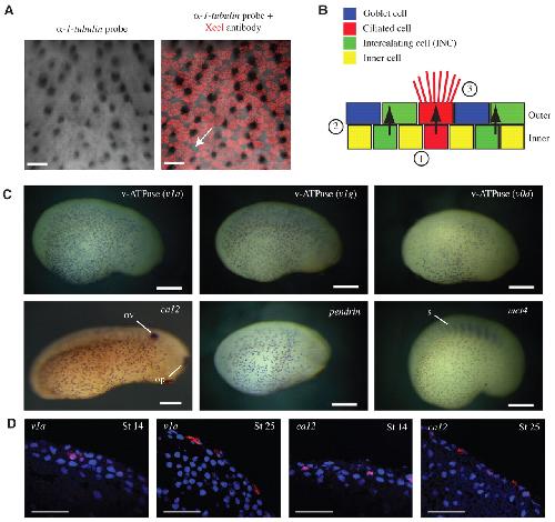 Fig. 1. Ionocytes (cells expressing ion modulators) show a scattered epidermal distribution. (A) Images of whole-mounted X. tropicalis tadpole skin (stage 27) showing that ciliated cells, visualised with an α1-tubulin probe, and goblet cells, recognised by staining with an anti-lectin antibody, anti-xeel (red), account for the majority of cells in this tissue. However, a cell type that does not express either α1-tubulin nor xeel is also present (arrow). Approximately 60% of cells in this tissue are goblet cells, 18% are ciliated cells and approximately 22% represent an uncharacterised cell type(s). (B) Model for the development of the mucociliary epidermis of Xenopus. During the early neurula stage, ciliated cells (red) and other INCs (green) are specified in the inner epidermal layer (1; yellow). By the late neurula stage, both cell types intercalate into the outer layer (2; blue), where ciliated cells undergo ciliogenesis (3) [modified from Stubbs et al. (Stubbs et al., 2006)]. (C) Several ion transporters and enzymes show a scattered, punctate expression pattern in the epidermis by in situ hybridisation. This includes three subunits of the v-atpase enzyme complex (v1a, v1g and v0d), ca12 (also expressed in the otic vesicle and olfactory placode), slc26a4 (pendrin) and mct4 (also expressed in the somites). ov, otic vesicle; op, olfactory placode; s, somites. (D) Sectioning of embryos probed for v1a or ca12 (red) by fluorescent in situ hybridisation and DAPI staining for nuclei (blue). At the neurula stage (stage 14), cells expressing v1a and ca12 are located in the inner layer of the epidermis and then move into the outer layer by tailbud stage (stage 25). Scale bars: 50 μm (A,D); 250 μm (C).
