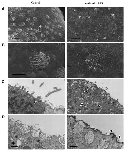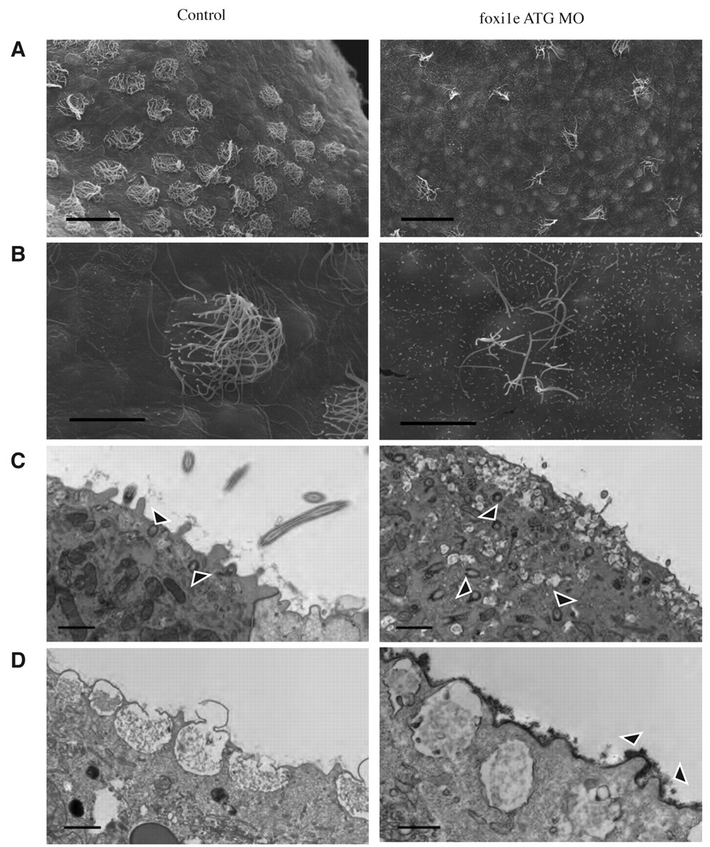 Fig. 7. Loss of ionocytes affects the development of ciliated and goblet cells. (A,B) SEM and (C,D) TEM images of stage 27 tadpole epidermis of control and foxi1e-ATG-MO-injected embryos, as indicated. (A) Knockdown of foxi1e causes loss of cells with apical pits (ionocytes) but ciliated cells are still present. Scale bars: 25 μm. (B) High-magnification images reveal that ciliated cells in foxi1e knockdown embryos possess fewer cilia than controls. Scale bars: 10 μm. (C) TEM images show that, in the control, basal bodies are located beneath the apical membrane (arrowheads), whereas, in the foxi1e morphant embryos, numerous basal bodies are abnormally located deep in the cytoplasm (arrowheads). Scale bars: 1 μm. (D) Goblet cells develop an increased number of cellular protrusions, resembling microvilli, in the foxi1e morphant embryos (arrowheads) compared with goblet cells of control embryos. Scale bars: 1 μm (control); 500 nm (foxi1e ATG MO).