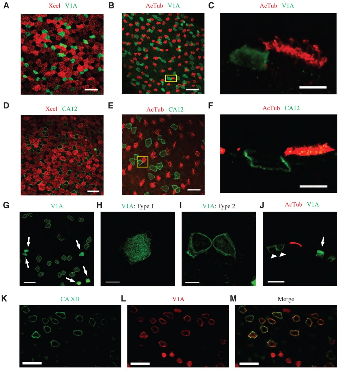 Fig. 2. Most ionocytes develop in contact with ciliated cells. (AâF) Whole-mount co-immunostaining for xeel (A,D), acetylated α-tubulin (B,E) and v1a (AâC) or ca12 (DâF) in X. tropicalis tadpole epidermis shows that v1a-or ca12-expressing cells are neither goblet or ciliated cells but develop in close association with ciliated cells. High magnification of the area enclosed in a yellow box in B and E is shown in cross-section in C and F. v1a (C; green) shows close coupling with ciliated cells (C; red), whereas ca12 shows distinct basolateral staining in these transverse sections (F; green). The ca12-expressing cell (green) is also in direct contact with a ciliated cell (red). (G) Immunostaining of v1a (green) shows two distinct cell types. Approximately 30% of cells show bright apical staining corresponding to type 1 cells (highlighted with arrows), whereas the remaining v1a-expressing cells (type 2) show lateral membrane staining. (H,I) High magnification of type 1 and type 2 cells, respectively. (J) Cross-section of type 1 (arrow) and type 2 (arrowhead) v1a-expressing cells (green) shown adjacent to ciliated cells (red). (KâM) Co-immunostaining of ca12 (green) with v1a (red) shows colocalisation of these two markers in type 2 cells. Scale bars: 50 μm (A,B,D,E,G,KâM); 10 μm (C,F,H,I); 20 μm (J).