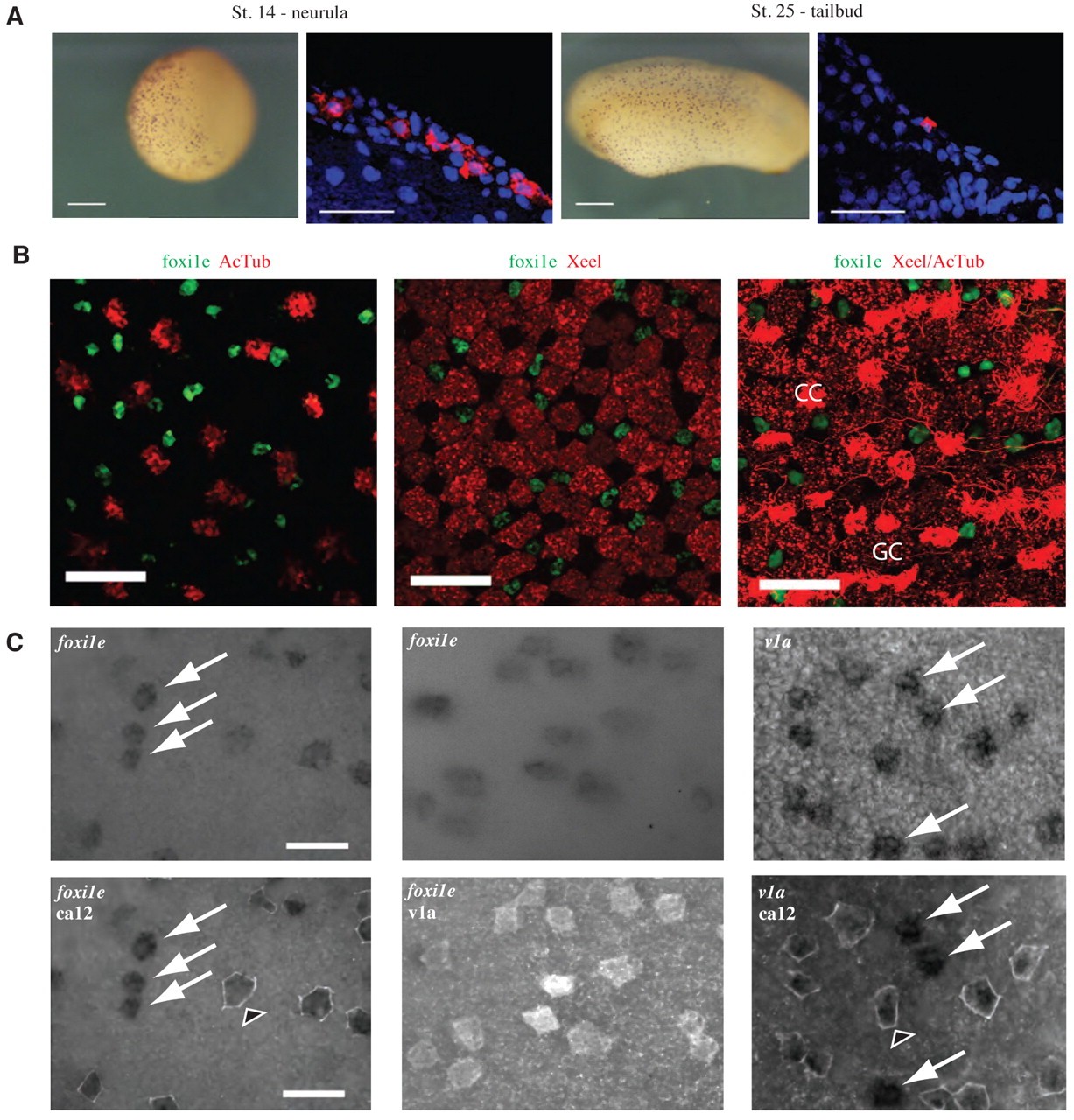 Fig. 4. Ionocytes express the transcription factor foxi1e. (A) Whole-mount in situ hybridisation and cross-sections of stage 14 and stage 25 embryos hybridised with foxi1e probe. foxi1e is expressed in a spotted pattern and the location of the expressing cells changes from the inner to outer layer between the neurula and tailbud stages. Sections are on fluorescent in situ samples with foxi1e in red and DAPI staining in blue. Scale bars: 250 μm (whole mounts); 50 μm (sections). (B) Whole-mount double immunostaining of stage 27 tadpoles with anti-foxi1e, anti-acetylated tubulin and anti-xeel, as indicated. foxi1e-expressing cells (green) are distinct from ciliated (CC) and goblet (GC) cells. Scale bars: 50 μm. (C) Whole-mount in situ hybridisation with foxi1e probe and immunostaining with anti-ca12 and anti-v1a, in the combinations indicated. Upper and lower panels represent the same field of imaging, with upper panels showing the in situ probes and lower panels showing antibody staining overlaying the in situ probes. In the foxi1e/ca12 combination, arrows point to three cells that express foxi1e but not ca12, and arrowhead points to a cell that expresses both. In the foxi1e/v1a combination, complete overlap is detected. In the v1a/ca12 combination, arrows point to three cells that express v1a but not ca12, and arrowhead points to a cell that expresses both. Scale bars: 40 μm.