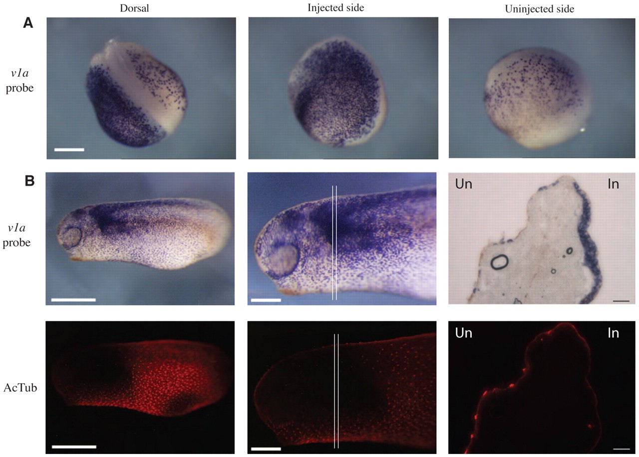 Fig. 5. Misexpression of foxi1e causes an increase in ionocytes at the expense of ciliated cells. (A) Embryos injected with foxi1e-HA RNA (500 pg) and lacZ (marks injected side; blue) were hybridised with the v1a probe at neurula stage. Whole-mount embryo is shown in the views indicated. Scale bar: 250 μm. (B) The injected side of an embryo shown at low magnification (left), high magnification (middle) and in cross-section (right). Upper and lower panels represent the same field of imaging, with upper panels showing in situ hybridisation with the v1a probe (purple) and lower panels showing antibody staining for the ciliated cell marker acetylated α-tubulin. Parallel lines in the high-magnification images show region that was sectioned. Sectioned images show an abundance of v1a ionocytes on the injected side (In) compared with the uninjected side (Un). Ciliated cells are absent in regions overexpressing v1a and this is emphasised by comparison of the injected side with the uninjected side in cross-sections. Scale bars: 500 μm (low magnification); 250 μm (high magnification); 100 μm (sections).