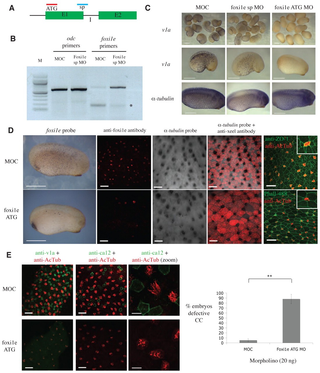 Fig. 6. Impact of foxi1e knockdown on the mucociliary epidermis. (A) Diagrammatic representation of foxi1e, showing the position of the ATG MO (red) and sp MO (blue). E1, exon 1; E2, exon 2; I, intron. (B) Reverse transcriptase (RT)-PCR with ornithine decarboxylase (odc) control and foxi1e primers, showing that abnormal splicing of foxi1e is observed when a foxi1e sp MO is injected. Asterisk marks reduction in foxi1e splice product in foxi1e splice morphants compared with control. (C) Injection of foxi1e sp MO reduces (11/11) and injection of foxi1e ATG MO abolishes (11/11) the expression of v1a, whereas MOC has no effect (0/9) at early tadpole stage as shown by whole-mount in situ hybridisation. Neither foxi1e sp MO (0/13), foxi1e ATG MO (0/11) or MOC (0/10) had an effect on expression of the ciliated cell marker α-1-tubulin. Scale bars: 500 μm. (D) Embryos were injected with MOC or foxi1e ATG MO (20 ng each) and analysed as indicated. In situ hybridisation with foxi1e probe shows that the spotted expression of foxi1e is reduced (9/9) in foxi1e morphants, whereas MOC has no effect (0/11). Scale bars: 500 μm. Immunostaining of tadpole epidermis with anti-foxi1e antibody shows that the protein expression is reduced in foxi1e morphants (11/12) but not in the MOC controls (0/10). In situ hybridisation with α-1-tubulin probe (black), combined with anti-xeel antibody staining (red), as indicated, reveals that, in the foxi1e morphants, the number of cells that are not positive for either α-1-tubulin or xeel is greatly reduced compared with controls. This suggests that the missing cells are ionocytes. Actin staining (phalloidinâAlexa-Fluor-488; green) combined with anti-acetylated α-tubulin antibody (red) reveals that epidermal cells are arranged in a rosette pattern around each ciliated cell in the foxi1e-ATG-MO-injected epidermis, but in the MOC control (stained with anti-ZO-1 and acetylated α-tubulin), this rosette formation is broken by the insertion of ionocytes (inset shows higher-magnification view). See text for details. Scale bars: 50 μm. (E) Immunostaining for v1a (green), ca12 (green) and acetylated α-tubulin (red) in the combinations indicated confirms that ionocyte markers are missing in foxi1e-ATG-MO-injected embryos (34/35; n=5 experiments) but not in MOC controls (0/35; n=5 experiments). Scale bars: 50 μm. High-magnification images (zoom; scale bar: 20 μm) reveal that ciliated cells are abnormal in the foxi1e morphants. Bar graph shows quantification of the experiments looking at defective ciliated cells (n=4 experiments). Defective ciliated cells were evident in the majority of foxi1e ATG morphant embryos (42/47), but not in MOC-treated embryos (2/32). **P=0.0018.