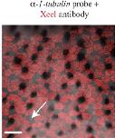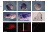 Itln1 Ab 1 (Xeel-ab), in red, in the skin of a Xenopus tropicalis embryo, at NF 27 stage, showing expression in epidermal goblet cells.