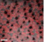 itln1 (intelectin 1 (galactofuranose binding) gene expression in epidermis of a Xenopus tropicalis embryo, detected via antibody (Itln1 Ab3, in red) at NF stage 27.