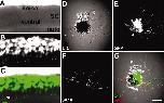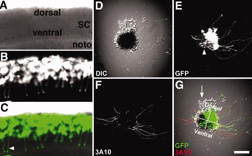 Figure 1. Identifying neuronal types in cell culture. AâC: Confocal microscope images of a â¼24 hpf live Xenopus embryo that was previously injected at the 8âcell stage with mRNA encoding GFP into a single blastomere fated to make dorsal spinal cord. Note many ventrally projecting CIs (commissural interneurons; arrowhead in C). D: DIC image of a spinal cord explant in crossâsection from the same spinal cord as in (AâC) cultured onto PDLâLN coverslips for 24 h. E: GFP fluorescence shows many labeled RB (RohonâBeard) and CIs extending from the dorsalâlateral region of this explant. Also note many presumed CIs that extend toward the floor plate and stay within the explant (arrowhead). F: Fixed explant that was immunofluorescently labeled with an antiâneurofilament antibody (3A10) that is specific for CIs and the peripheral process of RB neurons in vivo. Note dorsal lateral labeled axons emerge from both sides of spinal explant G. Merged image of fluorescent and DIC channels with dorsalâventral and rightâleft quadrants indicated. Presumed neural crest cells (arrow) are often observed migrating from the dorsal aspect of spinal cord explants. Scale bar, 62 μm (in AâC) and 100 μm (in DâE). [Color figure can be viewed in the online issue, which is available at wileyonlinelibrary.com.] |