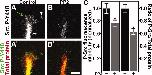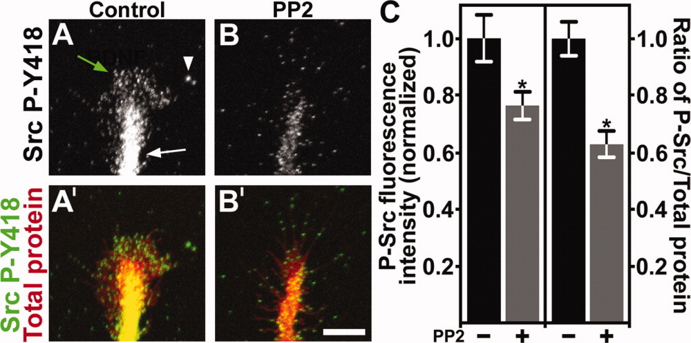 Figure 2. Quantification of active Src in growth cones by ICC. A: Control growth cone immunolabeled with antibodies against phosphoâtyrosine 418 Src (PâY418 Src). Note intense labeling in the axon shaft (white arrow), peripheral veil (green arrow) and some labeled filopodial tips (arrowhead). B: A growth cone treated with the Src inhibitor PP2 for 5 min before immunolabeling for PâY418 Src. Note reduced labeling throughout this growth cone compared to control. Aâ², Bâ²: The growth cones from (A, B) were colabeled for total protein (pseudocolored red) with Alexa Fluor 647 carboxylic acid, succinimidyl ester. All images were collected with a confocal microscope. C: Normalized total fluorescent intensity measurements of PâY418 Src immunolabeling, and the normalized PâY418 Src/total protein ratio. PP2 treatment results in a significant decrease in PâY418 Src by both measures. *p < 0.05. Scale bar, 10 μm. [Color figure can be viewed in the online issue, which is available at wileyonlinelibrary.com.] |