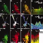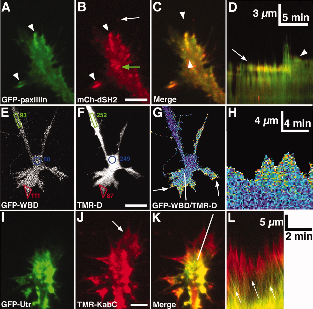 Figure 3. Analysis of cell signaling and structure with live cell imaging. A, B: Total Internal Reflection Fluorescence (TIRF) microscopy images of paxillinâGFP and mCherry dualâSrc homology 2 domain (mChâdSH2) fluorescent images of a growth cone on PDLâLN. Note that paxillin and phosphotyrosine (PY), as revealed with mChâdSH2, colocalize at adhesion sites (arrowheads in A, B), whereas the tip of a growing filopodium has PY, without paxillin (arrow in B). C: Merged image of the growth cone in (A, B) shows colocalization at several peripheral adhesions. Note that mChâdSH2 puncta within the central domain are mobile vesicles (green arrow in B). D: Single line kymograph (see text for details) constructed from region between the arrowheads (C). Note a stable adhesion (arrow) that disassembles after a new protrusion extends forward, followed by the formation of a second adhesion (arrowhead), which stabilizes the receding protrusion. Scale bar, 10 μm in all images and as indicated in kymographs. E, F: GFPâWASP binding domain (GFPâWBD; active Cdc42 binding) and tetramethylrhodamineâdextran (TMRâD; volume marker) fluorescent images of a growth cone on LN captured with a confocal microscope. The average pixel intensities (8âbit scale) within regions at the growth cone periphery (red), central domain (blue) and axon (green) show that GFPâWBD is selectively enriched in the peripheral lamellipodia of this growth cone. G: A pseudoâcolored ratio image of the growth cone in (E, F) shows the GFPâWBD/TMRâD ratio is elevated throughout peripheral lamellipodia and filopodia (arrows). H: Single line kymograph constructed from region indicated by the white line in (G). Note an elevated WBD/TMRâD ratio during lamellipodial protrusion. I, J: GFPâUtrophin (GFPâUtr; Fâactin probe) and TMRâKabiramide C (TMRâKabC; Fâactin barbed end binding) fluorescent images of a growth cone on PDLâLN collected with a TIRF microscope. Note bright TMRâKabC fluorescence at the periphery (arrow in J), indicating a high concentration of Fâactin barbed ends. K: Merged image of the growth cone in (I, J) shows strong colocalization of GFPâUtr and TMRâKabC in central domain foci, but primarily TMRâKabC in the peripheral domain. Weak labeling of peripheral actin with GFPâUtr is consistent with the slow association rate of GFPâUtr onto recently polymerized Fâactin (Rybakova et al., 2006). L: Single line kymograph constructed from region indicated by the white line in (K). The slope of the diagonal bands of GFPâUtr and TMRâKabC fluorescence (arrows) indicates a retrograde flow rate of â¼4 μm/min. Scale bars, 5 μm or as indicated. [Color figure can be viewed in the online issue, which is available at wileyonlinelibrary.com.] |