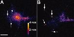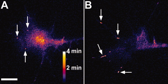 Figure 4. Heat maps of point contact lifetime. A, B: Heat maps indicating point contact lifetime generated by applying a series of filters (see the text for details). Images were generated from of a Xenopus retinal ganglion cell growth cone expressing paxillinâGFP before (A) and after (B) the addition of 1 μg/mL EphrinA1. The arrows highlight point contacts. Note the stabilization of point contacts and partial collapse of the growth cone after addition of EphrinA1. Scale bar, 5 μm. [Color figure can be viewed in the online issue, which is available at wileyonlinelibrary.com.] |