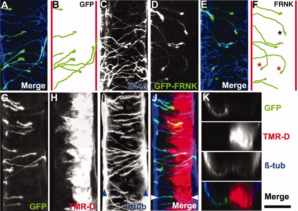 Figure 5. Labeling and measurement of CI axons. A: Maximum projection of a confocal zâseries of a ventral view of a 27 hpf neural tube immunolabeled with 3A10 (neurofilament in CIs) antibody (blue) and expressing GFP (green) in crossed CIs. Anterior is up in all ventral views. B: Traced trajectories of GFPâlabeled CIs (from A) at various points before, during and after midline crossing. Red lines indicate the position of the ventral fascicles. Note that CIs directly cross the midline and turn to ascend in the contralateral spinal cord after midline crossing. C: Ventral view of a 27 hpf neural tube immunolabeled with 3A10 antibody. D: Same embryo as (C) showing GFPâFRNK (dominantânegative FAK) expression targeted to the left side. E: Merge of 3A10 (blue) and GFPâFRNK (green) fluorescence. F: Traced trajectories of FRNKâexpressing axons in (D). One axon at the floor plate prematurely turned posteriorly (black asterisk), while two others aberrantly reoriented back towards the ipsilateral side (red asterisks). G, H: Confocal maximum projection of a ventral view of a 27 hpf neural tube that was electroporated at 21 hpf with mRNA encoding GFP and TMRâDextran. Note that GFP expression occurs in the dorsal CIs that project their axons ventrally on one side (G), while TMRâD was electroporated into ventral cells on the opposite side of the spinal cord (H). This distribution is likely due to charge difference between mRNA (negative) and TMRâD (positive). I: Ãâtubulin (Ãâtub) labeling of the spinal cord from (G, H). Note that Ãâtub labels all neurons in the spinal cord, including the neurons that form the ventral fascicles (blue arrowheads). J: Merged image of the spinal cord from (GâI) showing GFP (green), TMRâD (red) and Ãâtub (blue). K: Optical cross sectional views of confocal image stacks of the spinal cord from (GâJ) taken at the position indicated by the white arrowheads in (J). Scale bar, 50 μm (in AâJ) and 40 μm (K). [Color figure can be viewed in the online issue, which is available at wileyonlinelibrary. com.] |