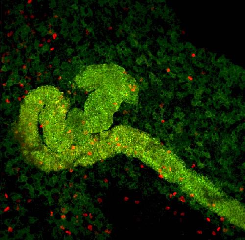 Stage 40 Xenopus laevis pronephros stained for kidney epithelia in green, and with the h3f3a antibody 1 phospho ser 10 in red to identify dividing cells